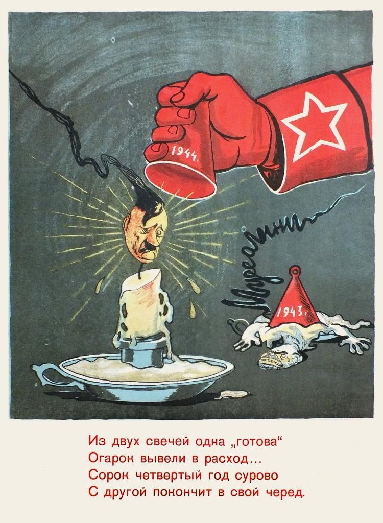 Плакат в карикатурной форме изображает в виде двух свечей Муссолини и Гитлера. Первая свеча – Муссолини – расплылась бесформенной кляксой, над второй свечой занесена рука с советской звездой на обшлаге рукава, держащая гасильник с надписью «1944».